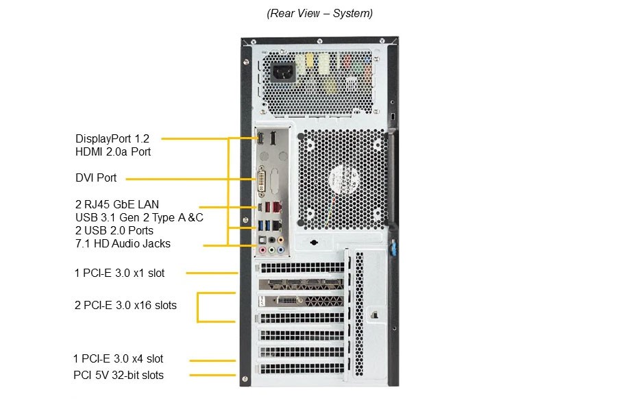 • 2x USB 3.1 Gen1 (front), 2x USB 3.1 Gen1 (rear), 2x USB 2.0 (rear)